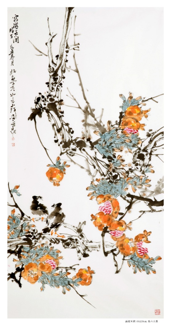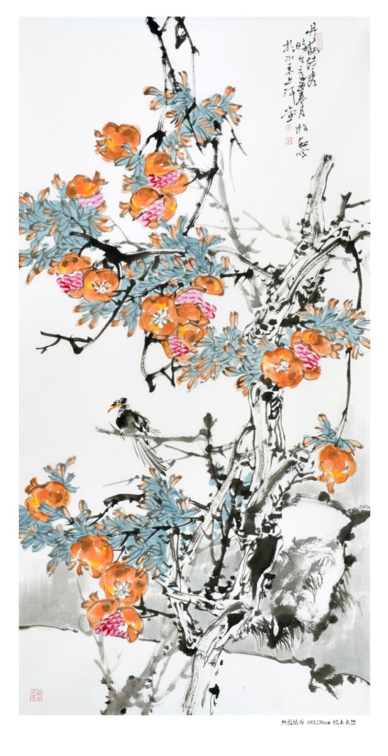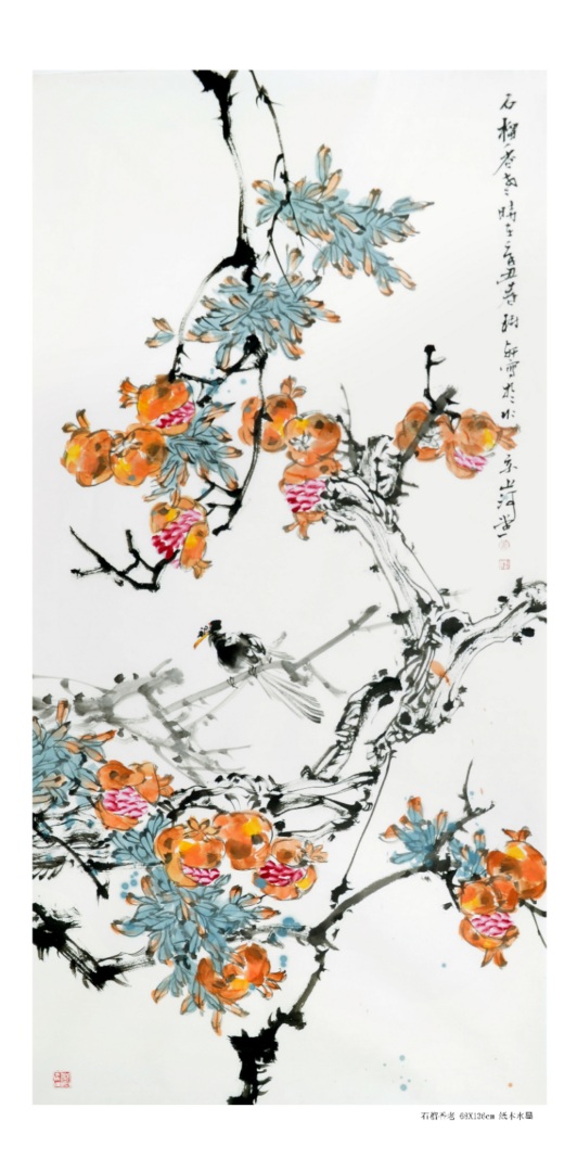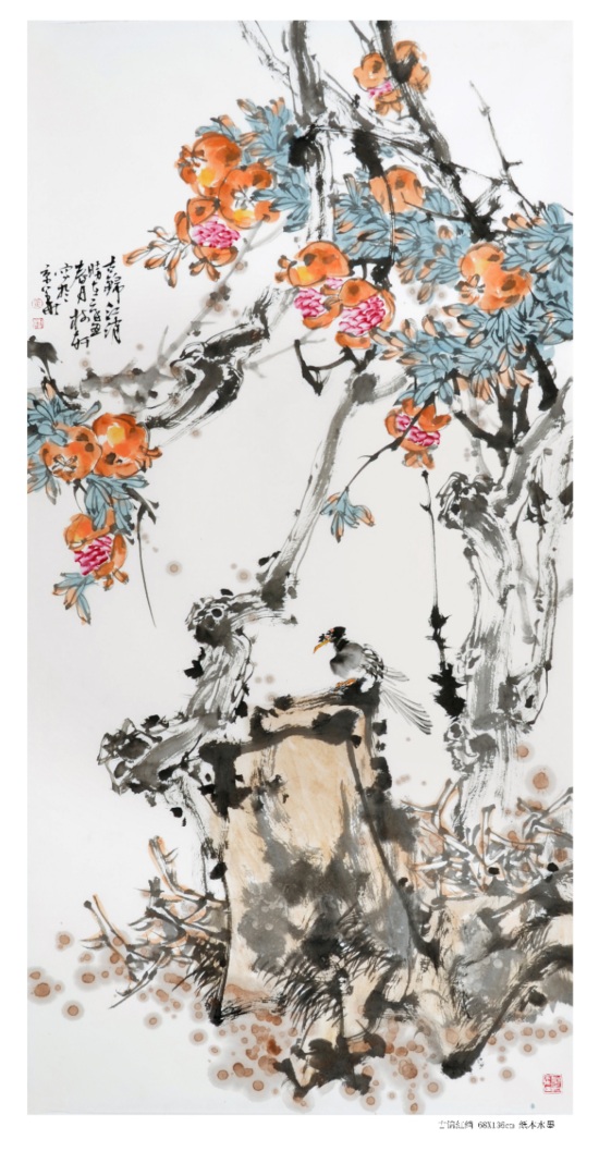 作品题材多为花鸟画,尤擅石榴、丝瓜、紫藤,风格灵动、飘逸、洒脱。